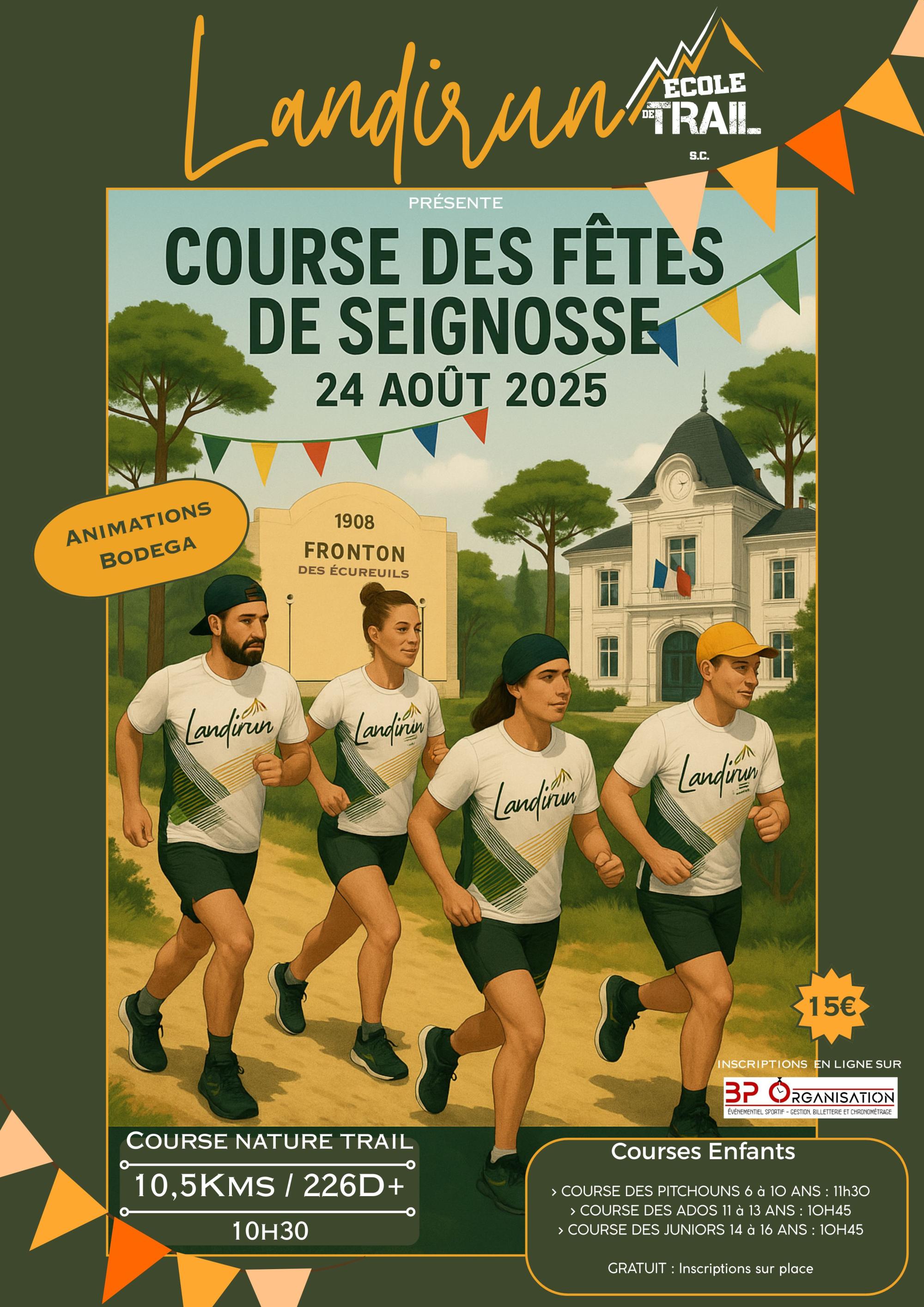Landirun organise le dimanche 24 août un Trail de 10,5 kms et 226m de dénivelé pour les Fêtes de Seignosse et assurera animations et bodéga sur la journée ! Départ à 10h30 devant la mairie pour un circuit sur les sentiers de la forêt landaise.